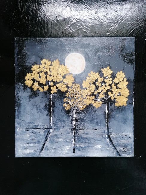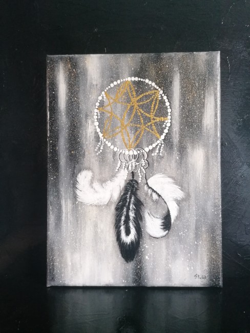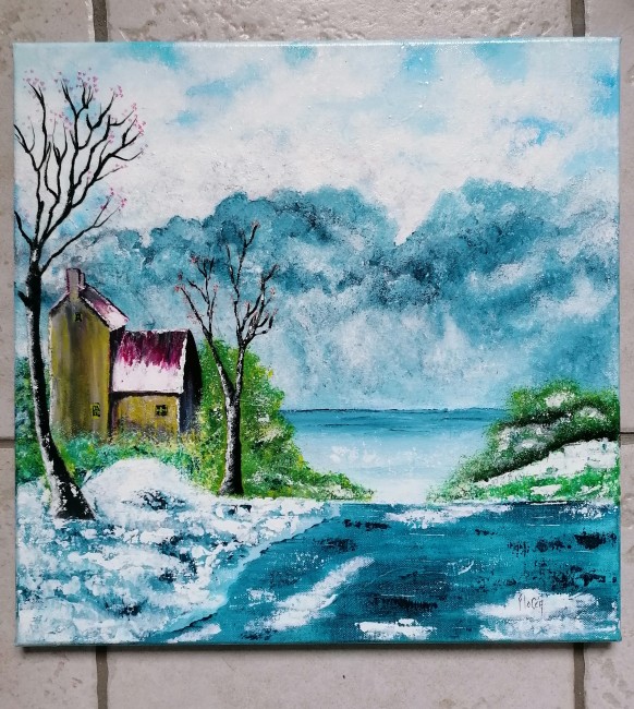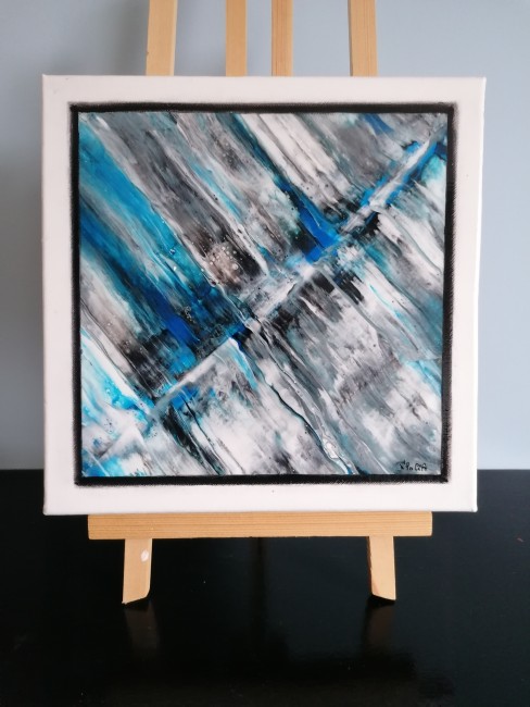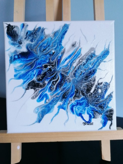 Je peins sur toile de coton sur châssis en bois, de différentes tailles il y a entre autre du pouring, de la peinture fluide, de la peinture au couteau, au pinceau...